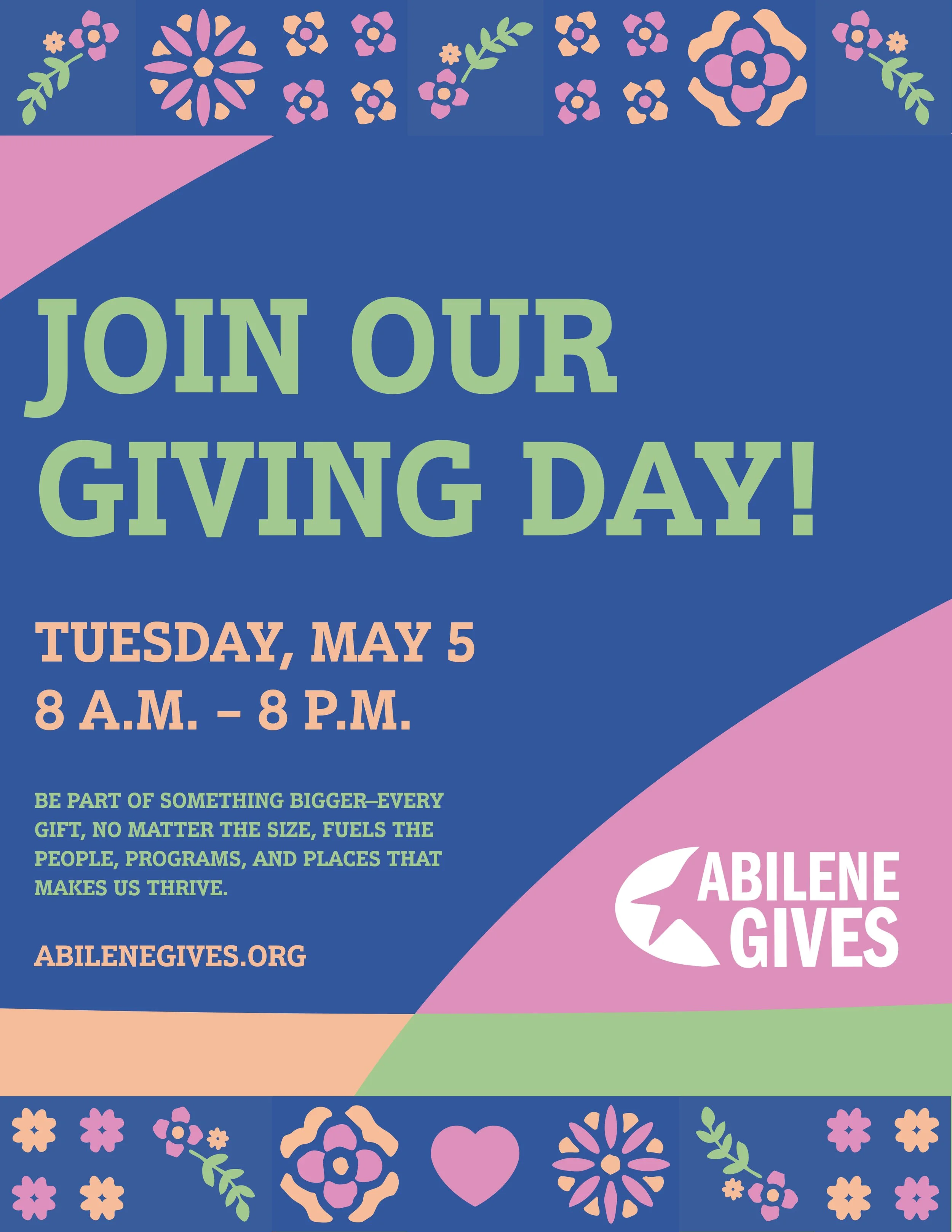 Abilene Gives is a day of giving that makes a significant impact on nonprofit organizations serving our communities! Abilene Gives 2026 will celebrate the 10th and final giving day. Join us right here at abilenegives.org on May 5 from 8 a.m. to 8 p.m. to raise money and awareness for nearly 200 local nonprofits. The Community Foundation of Abilene is honored to have hosted Abilene Gives. Learn more about the Foundation at cfabilene.org.