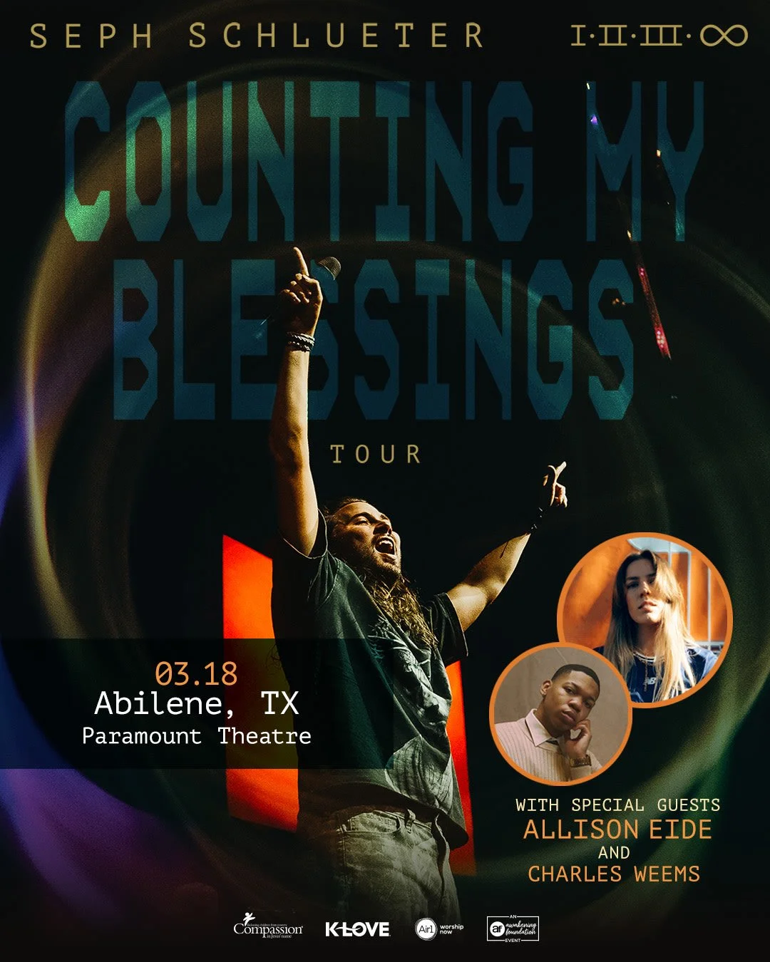 There are some concerts that feel good to be in the room for, and the “Counting My Blessings” Tour is one of them. Seph Schlueter will take the stage with the songs that have been repeated in your playlists and church services like “Counting My Blessings” and “Running Back to You.” Plus, the warmth of Allison Eide and her breakout, “Love Who I Am,” and the storyteller charm of Charles Weems with his “Slow Me Down.” You’ll leave this evening counting more than a few blessings of your own. Don’t let your friends attend this one without you… get your ticket!